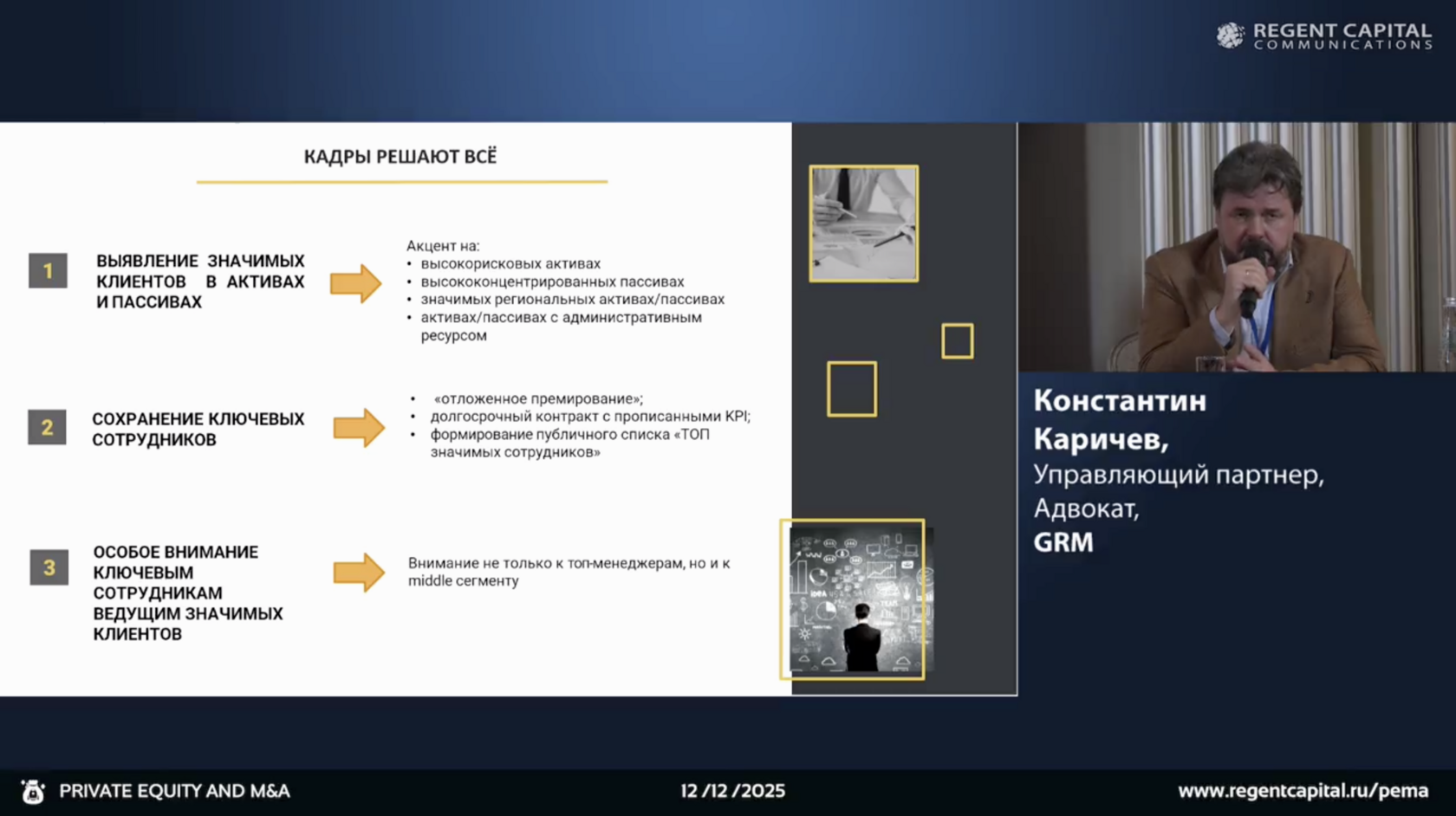 В части due diligence спикер подчеркнул поэтапность проверки: сначала финансовый анализ активов, чистого капитала и маржинальности, затем правовой, налоговый и трудовой DD. Особое внимание необходимо уделять «скрытым» рискам — санкционному регулированию, связанным заёмщикам, стратегическому статусу банка и концентрации пассивов.