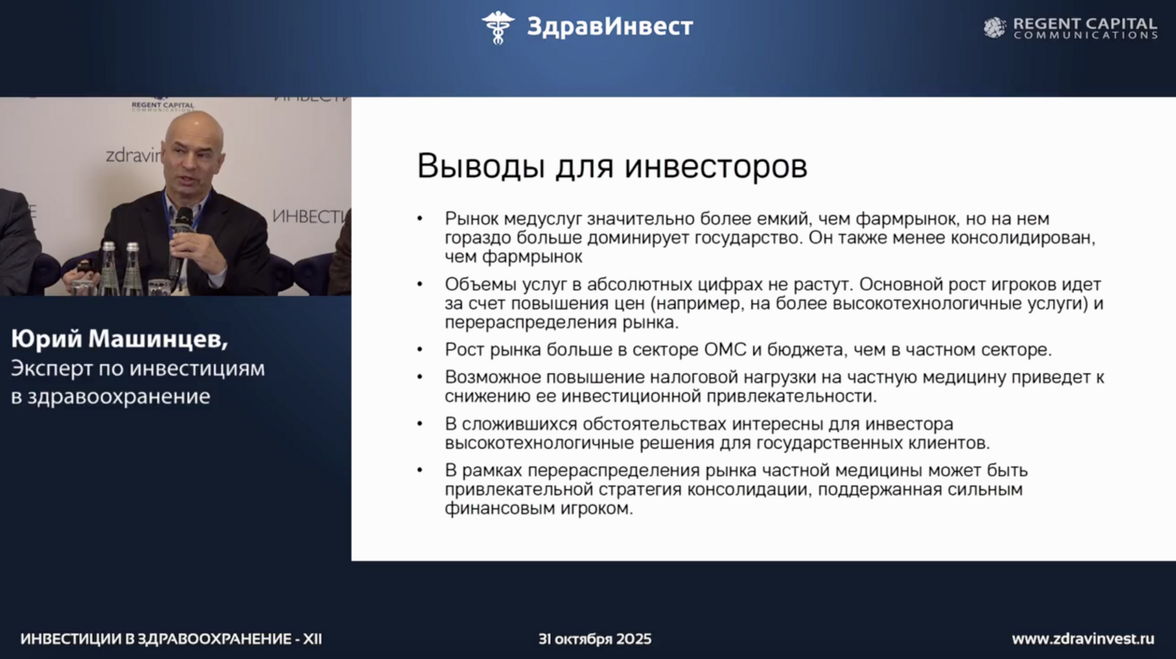 По словам Юрия Машинцева, российского фонда прямых инвестиций, рынок медицинских услуг остаётся устойчивым, но требует переосмысления стратегий инвесторов. Он привёл цифры, показывающие структурные сдвиги: при стабильном числе пациентов и сокращении медицинского персонала на 1–2% в год объём рынка продолжает расти — прежде всего за счёт увеличения стоимости высокотехнологичных услуг.